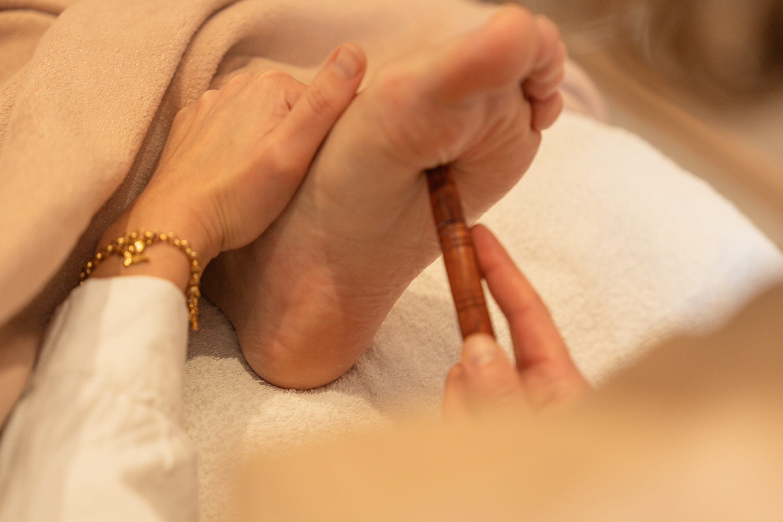 Technique inspirée des traditions asiatiques, elle associe pressions appuyées et travail rythmé le long des lignes énergétiques des pieds.