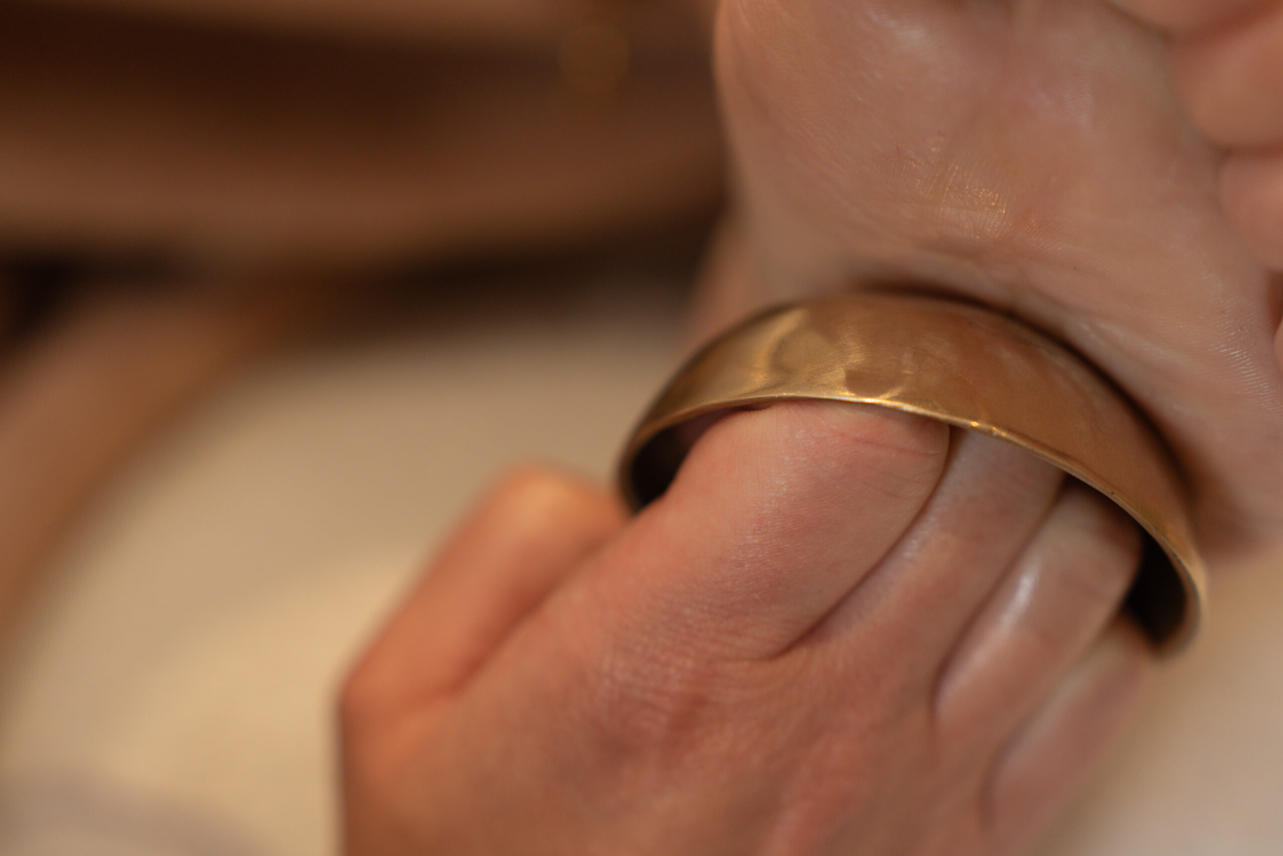 Dans la tradition ayurvédique, cet alliage est associé à l’équilibre et à la régulation de la chaleur interne. Contrairement à la réflexologie plantaire classique, le travail repose davantage sur des mouvements circulaires et enveloppants que sur des pressions ciblées point par point.