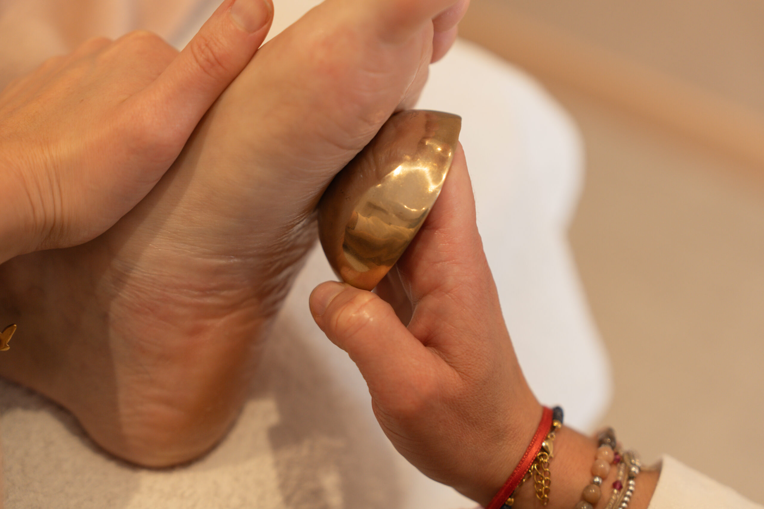 Il se pratique sous la plante des pieds à l’aide d’un petit bol composé d’un alliage de métaux (traditionnellement cuivre et zinc), utilisé avec une huile neutre afin de permettre un mouvement fluide et progressif.