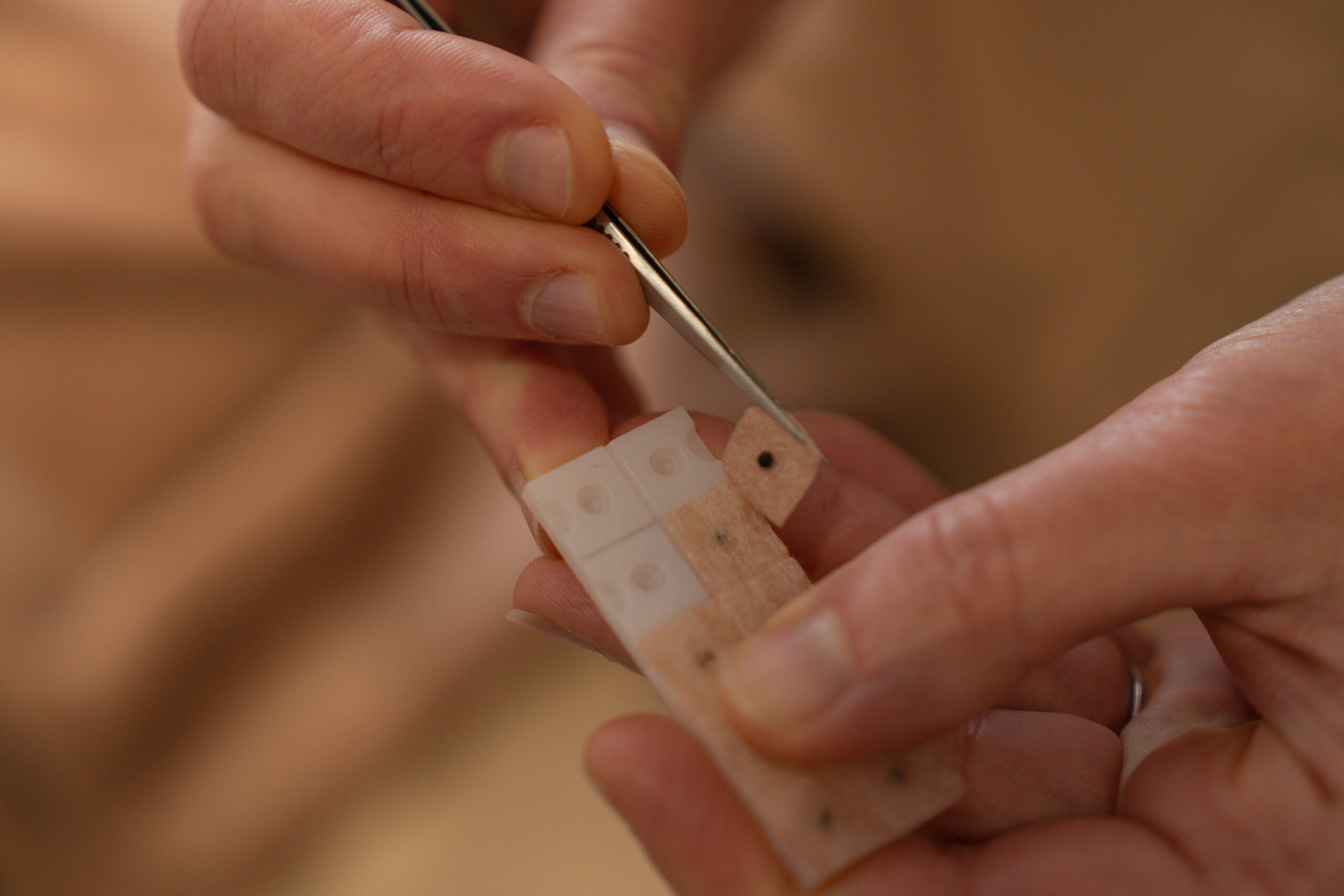 Une petite graine naturelle de vaccaria est fixée sur le point choisi à l’aide d’un adhésif discret. Elle permet de prolonger la stimulation pendant quelques jours, en exerçant une légère pression si nécessaire.